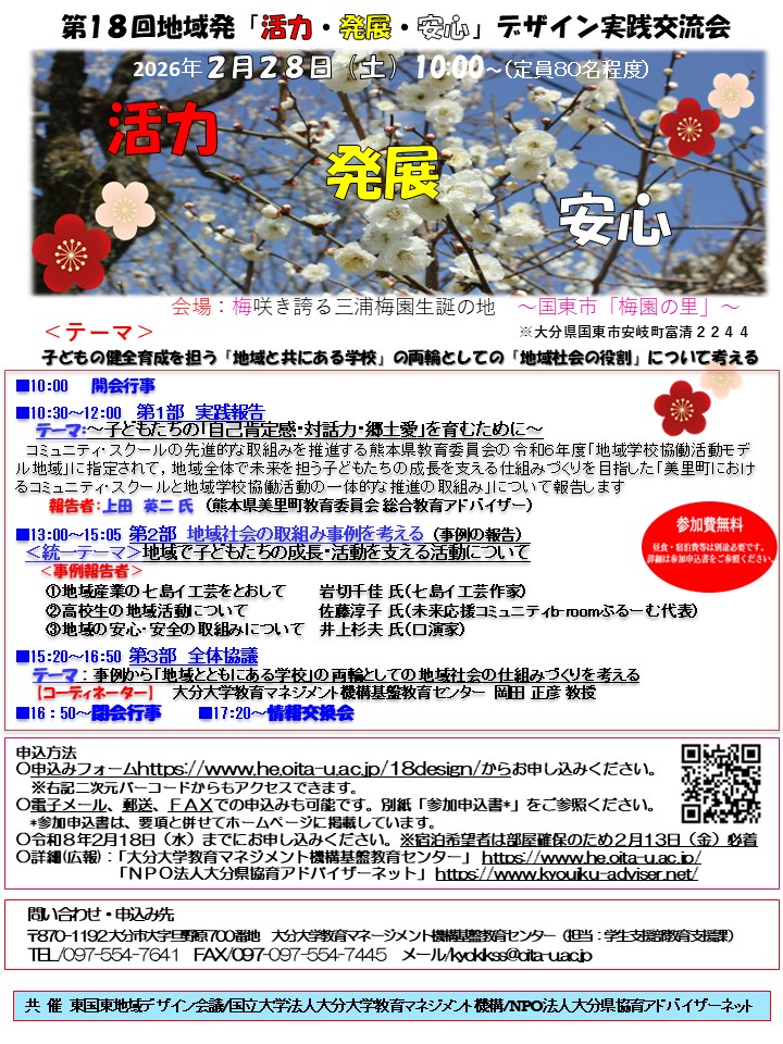 令和8年2月28日(土) 梅園の里にて、第18回地域発『活力・発展・安心』デザイン実践交流会を開催します。