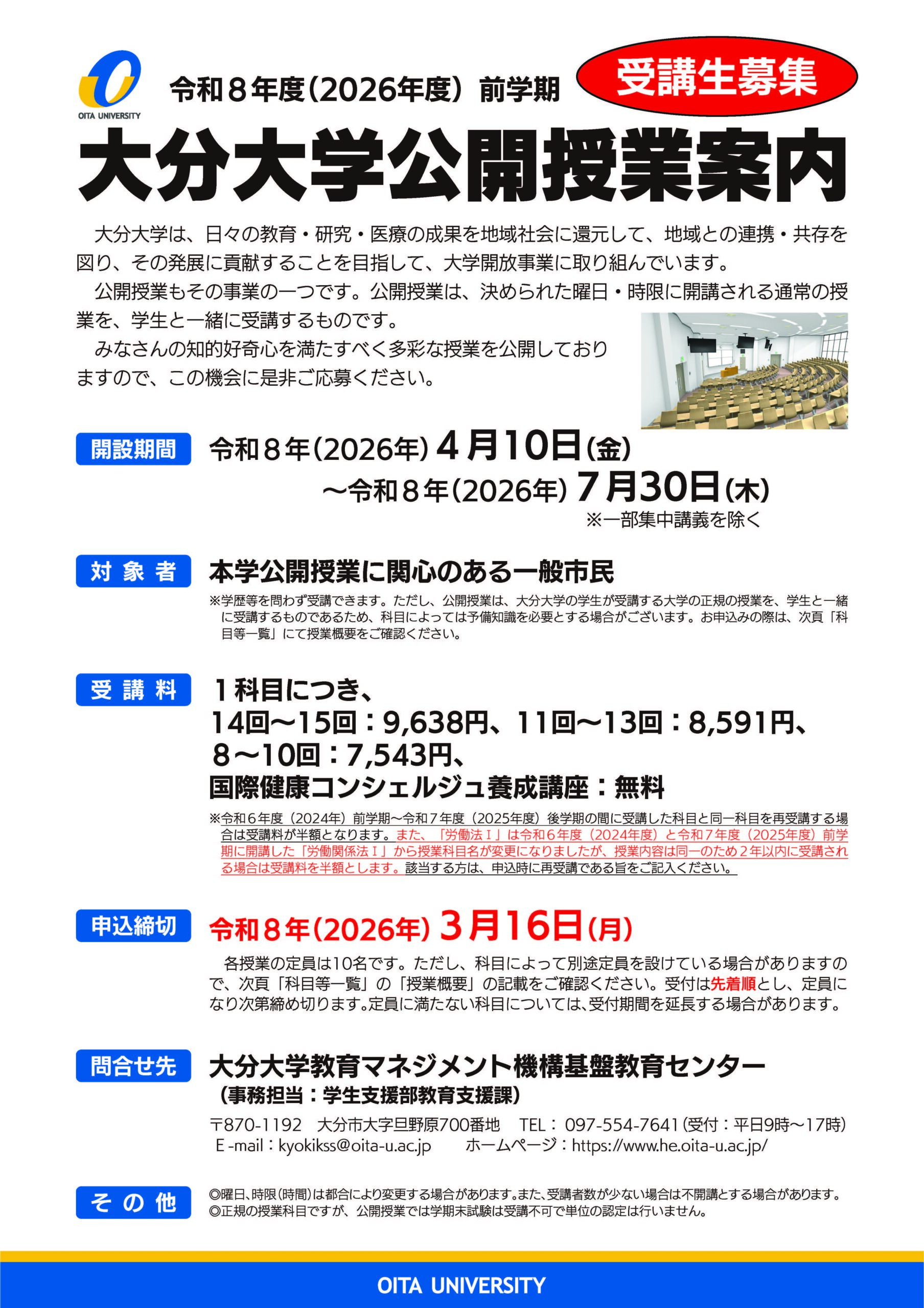 【4月10日~7月30日】令和8年度(2026年度)前学期大分大学公開授業